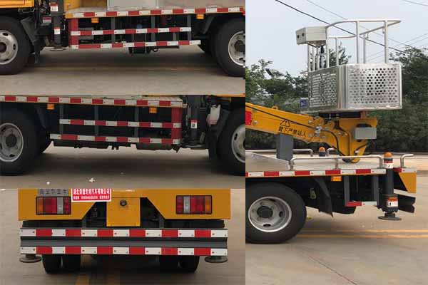 该车由液压机构,悬臂,转台,工作平台,支腿等构成,通过悬架伸缩,转台回转,将工作平台举升至作业位置;侧、后防护材质均为Q235,焊接连接,后防护截面尺寸100?0mm,下边缘离地高度400mm,ABS系统型号APG3550500A,ABS系统生产厂家:浙江亚太机电股份有限公司,随底盘选装驾驶室,选装不同外观样式。 |