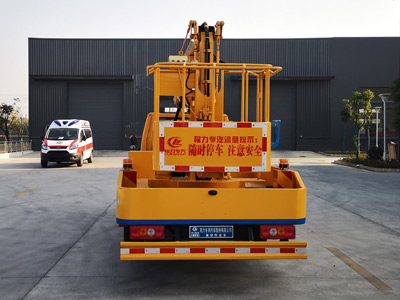 该车前伸为800mm。选装二节工作臂时,作业高度为12米; 选装三节工作臂时,作业高度为14米和16米。防护材料:Q235A碳钢,连接方式:左右侧面及后下部防护均采用焊接连接,后部防护断面尺寸(mm):170?0,后部防护离地高度(mm):350。ABS系统型号:APG3550500A,ABS系统生产厂家:浙江亚太机电股份有限公司。该车可选装带电控操作箱。专用装置:吊臂,主要用于高空作业,进行维修、安装、清洗、摄影、造船、化工、电力、剪枝、更换路灯及其他工程抢修作业。随底盘选装驾驶室。选装站臂、电控操作装置。 |