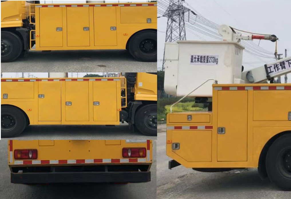随底盘选装驾驶室;后伸220mm;仅采用底盘3800mm轴距;ABS型号:3631010-C2000,生产厂家:东科克诺尔商用车制动系统(十堰)有限公司;侧面防护及后下部防护装置材料材质为Q235,侧面防护装置为整体式结构;后下部防护装置与车架螺栓连接,截面尺寸为130mm?0mm,离地高度为410mm.专用装置为高空作业装置,主要由上装平台、转台、臂架、液压系统系统等组成,用于电力、路政等高空作业区域.选装工具箱外观. |