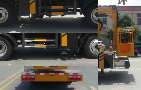 随底盘选装驾驶室。后伸320mm,侧、后防护材质均为Q235,侧防护为焊接连接,后防护为裙板结构,后部离地高度460mm,ABS厂家及型号:襄阳东风隆诚机械有限责任公司/ABS/ASR-24V-4S/4M.该车用于电力,通讯,路灯等高空作业;主要装置为升降平台,作业臂.“仅采用2800mm轴距底盘” |