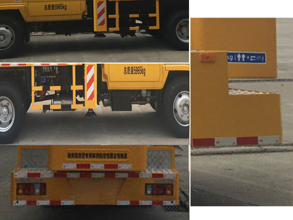 车长/前伸/前悬/轴距/后悬/后伸对应关系:7560mm/715mm/1015mm/3360mm/2170mm/300mm;7640mm/715mm/1015mm/3360mm/2170mm/380mm;7770mm/875mm/1015mm/3360mm/2170mm/350mm;选装钢制带内圈平台。选装封闭式作业平台。选装两侧前支腿罩壳造型。起重装置可不选装。该车型装备含有支腿、转台、臂架、工作平台等部件的高空作业装置,可将作业人员与工具送到指定高度位置进行作业。ABS及其控制器型号为:APG3550500A4,生产厂家为:浙江亚太机电股份有限公司。侧防护材质是Q235钢,连接方式是螺栓连接;后下部防护为裙板式结构,外敷钢板内后防护与副车架螺栓连接,材料为Q235钢,断面尺寸120mm?0mm,下缘离地高度350mm。 |