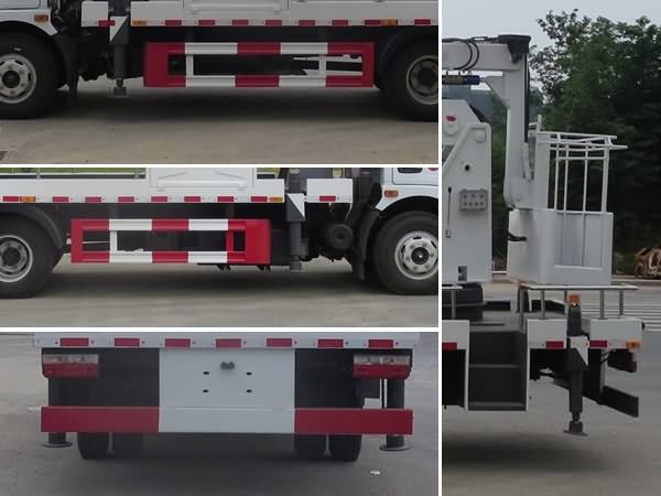 随底盘选装驾驶室;前悬与前伸对应(mm)关系:1130/880,1150/860;后伸90mm:仅采用3800mm轴距;主要专用装置有折叠臂,用于城市路政高空作业;ABS型号:ABS/ASR-24V-4S/4M,厂家:襄阳东风隆诚机械有限责任公司;侧面防护装置及后下部防护装置采用Q235材质,侧防护为螺栓连接,后防护为焊接;后下部防护装置断面尺寸(宽赘?(mm):50?40,离地高度:440mm. |