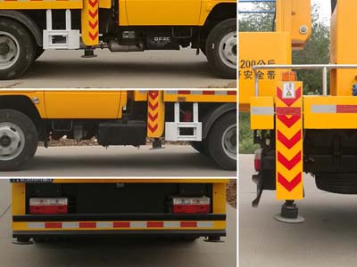 前伸145,后伸:330mm;随底盘选装驾驶室;选装吊钩;侧面防护及后下部防护装置材料材质:Q235,连接方式:焊接加螺栓连接;后下部防护装置断面尺寸(宽赘?:30?00(mm),离地高度:350mm;ABS厂家及型号:襄阳东风隆诚机械有限责任公司/ABS/ASR-24V-4S/4M;主要专用装置为折叠臂,用于抢修电力、通讯、路灯等高空作业. |