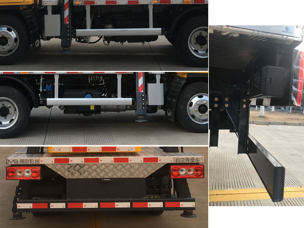 随底盘选装新前格栅及新logo.选装新前围。选装封闭式工作平台。该车型装备有支腿,转台,臂架,工作平台等部件的高空作业装置,可将作业人员与工具送到指定高度位置进行作业。ABS系统控制方式为4S/4M,ABS型号为CM4XL-4S/4M,生产厂家为广州瑞立科密汽车电子股份有限公司.侧防护材质为6063铝,连接方式为螺栓连接;后下部防护材质为Q235钢,连接方式为螺栓连接,断面尺寸为120mm?0mm,下缘离地高度400mm。 |