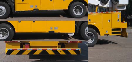 该车仅采用4500mm轴距底盘,整车后伸量135mm.侧面工具箱起到防护装置作用;后防护装置材料:Q235,连接方式:螺栓连接,后部防护装置截面尺寸260mm?0mm,离地高度420mm.上装型号:QDT5143JGKS,生产企业:青岛中汽特种汽车有限公司.随底盘安装ABS,ABS系统型号为4460046300,生产企业为威伯科汽车控制系统(中国)有限公司.爬梯处选装侧门.选装工具箱外观,工作斗侧置. |