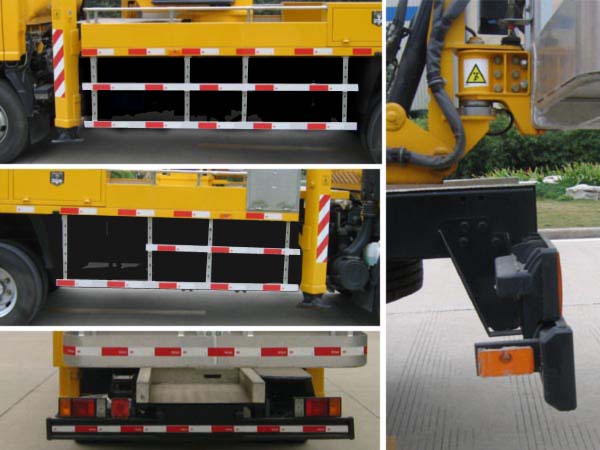 后伸155mm。选装工作平台样式。本车型专用功能为通过臂架折叠伸缩,转台回转,将工作平台举升至作业位置。专用装置主要包括臂架,转台,工作平台,支腿等。ABS及控制器型号为:APG3550500H1,生产厂家为:浙江亚太机电股份有限公司。侧防护材质为6063铝,连接方式为螺栓连接,后防护材质为钢板SAPH440,板厚3.2mm,与大梁采用螺栓连接,后防护断面尺寸150mmX49.7mm,下缘离地高度440mm。 |