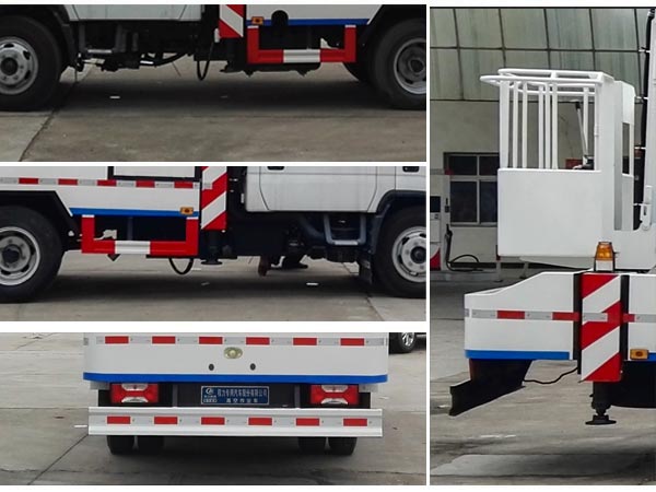 1、该车吊臂前伸为900mm,作业高度为14米和16米。上装选装二节工作臂时,作业高度为12米。2、防护材料:Q235A碳钢,连接方式:左右侧面及后下部防护均采用焊接连接,后下部防护断面尺寸(mm):180?0,后下部防护离地高度(mm):380。3. ABS系统控制器型号为APG3550500A6、VIE ABS-II,ABS系统控制器生产企业为浙江亚太机电股份有限公司、浙江万安科技股份有限公司。4.该车可选装带电控操作箱。5.专用装置:吊臂,主要用于高空作业,进行维修、安装、清洗、摄影、造船、化工、电力、剪枝、更换路灯及其他工程抢修作业。 |