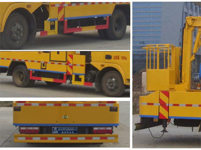 仅选用3800轴距底盘改装,该车吊臂前伸/前悬对应关系(mm)为1320/1070,1210/1180,1140/1250,1110/1280,940/1450。随底盘选装驾驶室。防护材料:Q235A碳钢,连接方式:左右侧面及后下部防护均采用焊接连接,后部防护断面尺寸(mm):170?0,后部防护离地高度(mm):365。ABS型号为3631010-C2000,生产厂家为东科克诺尔商用车制动系统(十堰)有限公司。专用装置:吊臂,主要用于高空作业,进行维修、安装、清洗、摄影、造船、化工、电力、剪枝、更换路灯及其他工程抢修作业。 |