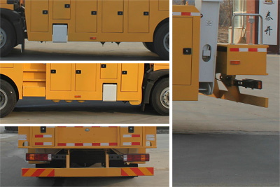 | 前伸量920mm;侧防护为裙板结构,与副车架螺栓连接,材质为Q235钢,离地高度为490mm;后防护材质为Q235钢,与副车架螺栓连接,截面尺寸为150mm?0mm,下缘离地高度450mm;工作平台选装单双斗。ABS系统型号为4460046300,生产企业为威伯科汽车控制系统(中国)有限公司。选装竖装的后组合灯,选装支腿型式及工具箱结构。 |