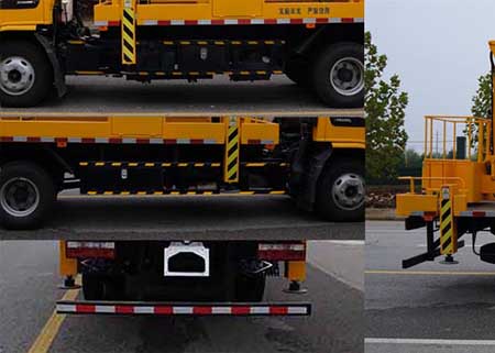 | 随底盘选装驾驶室,选装工作平台结构样式,选装起升架外观。前伸/前悬/后悬对应关系为(mm):880/1085/2300,855/1110/2300。侧防护材质采用Q345,螺栓连接;后防护采用冷弯型钢/Q235-B,焊接连接,截面尺寸(宽赘?(mm):50?20,离地高450mm。ABS系统控制器型号:CM4XL-4S/4K (4S/4M),ABS系统控制器生产厂家:广州市科密汽车制动技术开发有限公司;ABS控制器型号/生产企业:ABS 8/克诺尔制动设备(上海)有限公司。该车由液压或电动系统支配多支液压油缸,能够上下举升进行高空作业的车辆。 |