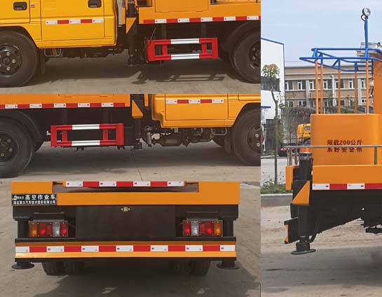 | 随底盘选装驾驶室;选装臂架前部不装吊钩结构;该车前伸200mm;侧防护装置材料Q235B,螺栓连接;后防护装置材料Q235B,焊接连接,截面尺寸(宽赘?mm:50?00,离地高430mm;ABS系统型号:APG3550500A,ABS系统生产厂家:浙江亚太机电股份有限公司;该车用途为抢修电力,通讯,路灯等高空作业,主要装置为升降平台,作业臂. |