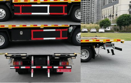 | 该车具备拖吊清障功能,上装型式为伸缩板结构,最大托举质量为550kg;选装一体板结构(带滚轮及不带滚轮),当选装一体板结构时整备质量为3560kg,最大托举质量为740kg;侧防护材料为Q235A,与底盘大梁采用螺栓连接;后防护材料为Q235A,与底盘大梁采用螺栓连接,离地高度为495mm;ABS系统型号: APG3550500A4,ABS生产厂家:浙江亚太机电股份有限公司 |