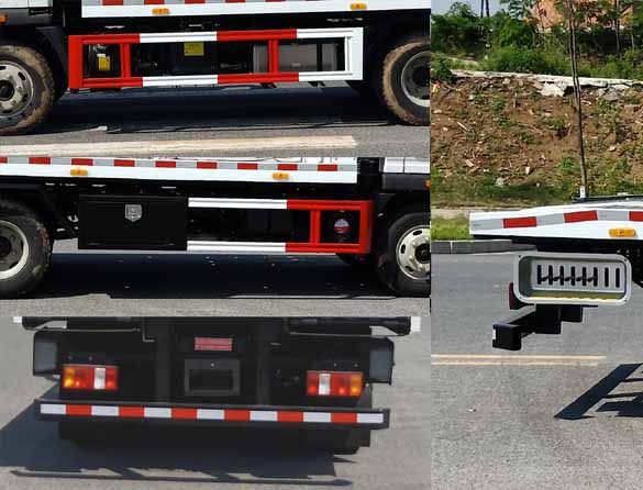 | 随底盘选装驾驶室;选装后部带托板结构,选装后部不带托板结构;当驾驶室准乘人数为3人时,托举质量为500kg,当驾驶室准乘人数为2人时,托举质量为565kg;侧防护材料Q235,焊接连接;后防护材料Q235,焊接连接,后部防护装置截面尺寸120mm?0mm,后部下边缘离地高度:390mm;ABS系统控制器型号/生产企业对应关系为:CM3XL-4S/3M(4SF)/广州瑞立科密汽车电子股份有限公司;XH-KQ4S3M-E01/广州市西合汽车电子装备有限公司;该车主要用于道路清障,专用装置为平板、绞盘、钢丝绳、油缸. |