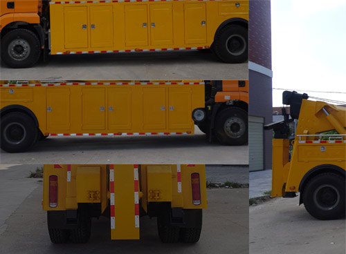 | 选装同系列驾驶室,选装前面罩及保险杠。当整备质量为16400千克时,托举质量为: 2470千克,2405千克与2,3人一一对应,当整备质量为15000千克时,托举质量为: 3870千克,3805千克与2,3人一一对应。ABS系统生产厂家及型号为:广州市科密汽车制动技术开发有限公司, 西安正昌电子有限责任公司, 浙江万安科技股份有限公司;ABS系统型号:CM4XL-4S/4K(4S/4M),ZQFB-V,VIE ABS-Ⅱ;侧防护为裙边结构;后防护装置由后托臂代替,最下端离地高为420毫米。该车主要用于清理道路障碍,主要专用装置为吊臂。车长/轴距/后悬对应关系:9375/6000/1850,9100/6000/1575,7945/4600/1820,7345/4000/1820. |
