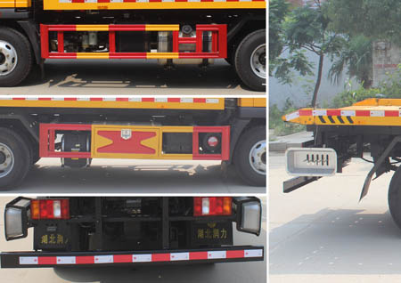 | 该车配备牵引绞盘和托举平板.用于道路车辆清障,城市清障救援.随底盘选装驾驶室.选装后部翻转板结构样式.当驾驶室准乘人数为3人时,托举质量为500kg,当驾驶室准乘人数为2人时,托举质量为565kg.侧、后防护材料采用Q235B,侧防护与车架螺栓连接.后防护与车架焊接连接,后防护截面尺寸(宽赘? (mm):50?00,后部防护离地高450mm.ABS系统型号为XH-KQ4S4M-E01,生产企业为广州市西合汽车电子装备有限公司;型号为CM4XL-4S/4M,生产企业为广州瑞立科密汽车电子股份有限公司;型号为VIE ABS-Ⅱ,生产企业为浙江万安科技股份有限公司.整车长/前悬/轴距/后悬(mm)对应关系为:5998/1160(1180)/3280/1558(1538), 5998/1160(1180)/3360/1478(1458). |