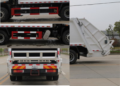 该车专用装置为垃圾箱体,压缩机构,主要用于转运生活垃圾.仅选用4500mm轴距.该车有2种配置:A(基本型),B(选装翻斗装置).配置A,整车长度9080,9110mm,后伸400mm;配置B,整车长度8880,8910mm,后伸200mm.侧防护材料为Q235A,与车辆连接方式为螺栓连接,后防护由车辆专用装置替代,专用装置下边缘离地高度为460mm.安装具有卫星定位功能的行驶记录仪随底盘装有ABS,ABS型号/生产厂家:3631010-C2000/东科克诺尔商用车制动系统(十堰)有限公司,ABS 8/东科克诺尔商用车制动系统(十堰)有限公司,4460046450/威伯科汽车控制系统(中国)有限公司.选用发动机对应油耗值(L/100km)分别为:D6.7NS6B230(23.7),DDi50E190-60(23.9),B6.2NS6B210(23.8),D4.5NS6B190(24.4).B6.2NS6B230(23.8).随底盘选装前下视镜,选装驾驶室卧铺侧窗装饰板,选装驾驶室顶部装饰灯,选装不同结构的车门裙板,选装前雾灯.