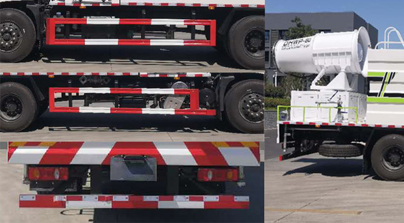 | ABS型号:3631010-C2000/ABS 8/ 4460046450;ABS生产企业:东科克诺尔商用车制动系统(十堰)有限公司/东科克诺尔商用车制动系统(十堰)有限公司/威伯科汽车控制系统(中国)有限公司;选装描述:选装喷雾,喷洒装置,随底盘选装驾驶室,选装后平台样式;侧后防护情况:该车侧面防护装置材料采用Q235,连接方式为螺栓连接,后防护装置材料为Q235,连接方式为焊接连接,后部防护装置的断面尺寸为:60?20(mm),离地面高度355mm;专用功能及装置:专用装置:水泵,远程射雾器,储液箱,洒水系统,主要用途为抑尘、降霾、除尘等,有效容积:8.2立方米,异型罐,长:3200mm,截面尺寸(宽x高,单位:mm):2400x1650;后伸尺寸:雾炮纵向放置时后伸量(mm):620,720,雾炮横向放置时后伸量为0;其他说明:采用4700轴距, 长度/前悬/轴距/后悬/后伸量对应关系(mm):9425/1400/4700/2705/620;9425/1430/4700/2675/620;9525/1400/4700/2705/720;9525/1430/4700/2675/720; |