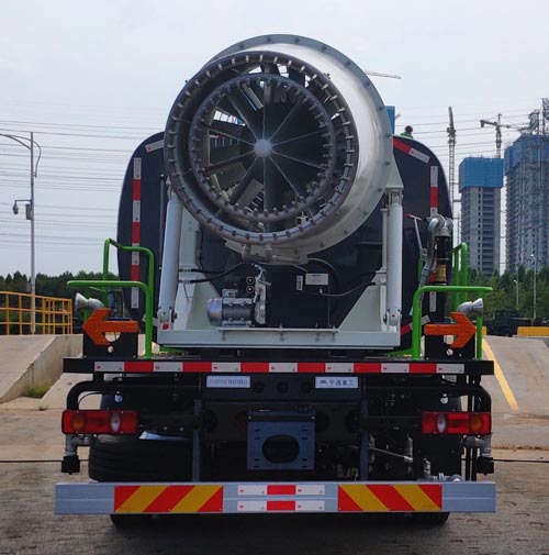 1.储能装置种类/生产企业:磷酸铁锂蓄电池/宁德时代新能源科技股份有限公司。2.该车仅选用底盘的4500mm轴距。3.可在全国销售。4.侧防护装置材料为Q355,与车架采用螺栓连接,后防护装置材料为QStE700TM,与车架采用螺栓连接,截面尺寸为:160?20(mm),离地高度为:470mm;5.ABS的型号:ABS-E 4S/4M,生产企业:威伯科汽车控制系统(中国)有限公司;6.该车型后伸为1060mm;7.随底盘选装充电接口安装位置,不同外形的电池罩格栅,无遮阳罩驾驶室外观,前围面罩,后视镜,后视镜下支座结构;驾驶室顶部中间3个装饰件为选装件;8.选装不同位置后洒、工具箱、涨型封头、后消防栓接口、罐体裙边、选装大直径雾炮、360环视(前、左、右)、动力单元装饰罩、不同结构的液压油箱、后箭头灯支架结构、长液位计,其中选装大直径雾炮时,对应车高为3325mm;9.可取消左侧加水口、右侧加水口、后上侧喷、后洒、对冲、前鸭嘴、后洒水炮、后箭头灯。10.该车装有雾炮喷洒专用装置,后置雾炮总成可左右回转,上下俯仰动作,用于道路,矿场,露天堆厂及爆破现场等的喷雾抑尘。