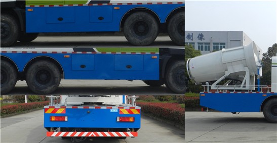 该车仅采用4350+1350mm轴距.该车可配装两种规格的雾炮机:雾炮机A/雾炮机B.配装雾炮机A时,后伸为850mm,整车长11130mm;配装雾炮机B时,后伸为450mm,整车长10730mm.该车装ABS, ABS生产厂家:东科克诺尔商用车制动系统(十堰)有限公司;型号:3631010-C2000.整车侧防护由侧部车身替代.后防护材料:Q235,后防护截面尺寸:120?0(mm), 螺栓连接,离地高度530mm.该车配置有雾炮机等专用装置,主要用于改善空气质量,降低空气中的灰尘,雾霾等现象.该车可随底盘选装一种驾驶室顶部无装饰灯具状态. |