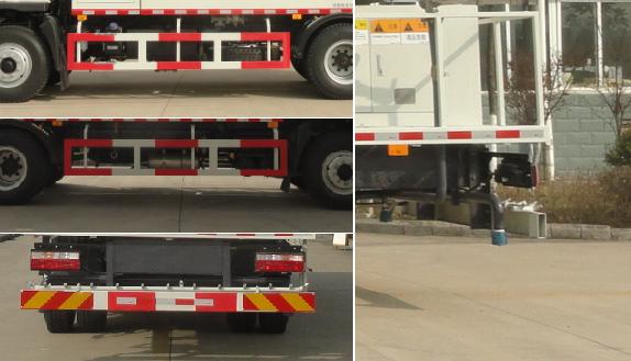 | 随底盘选装前组合灯、前雾灯、前面板;选装雾炮;仅选用底盘轴距4500mm;整车长/后伸(mm)对应关系为8920/620,9200/900;侧防护装置和后防护装置材料均为Q235,连接方式均为螺栓连接,后防护装置截面尺寸为150mm?0mm,离地高度为540mm;该车安装具有卫星定位功能的行驶记录仪;ABS系统控制器型号/生产企业:VIE ABSII/浙江万安科技股份有限公司. |