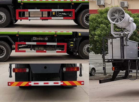 选装新格栅和新LOGO,选装后部喷雾机结构;仅采用4500mm轴距底盘;罐体有效容积11.61立方米;罐体外形尺寸(长度壮ぶ嶙短轴)(mm): 5000?350?440;侧防护材料Q235,螺栓连接;后防护装置材料为Q235B,焊接连接,断面尺寸为:120?0(mm),离地高度为:490(mm);ABS型号为CM4XL-4S/4M,生产厂家为广州瑞立科密汽车电子股份有限公司;专用装置主要是罐体和喷雾机,用于抑尘降霾. |