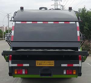| “该车通过垃圾箱,填装机构等装置,达到垃圾收集装填及推挤卸料的作业功能;该车有6种配置:A(无上料装置,基本型),B(选装提斗装置),C(选装翻桶装置),D(选装翻斗装置) ,E(选装翻盖翻桶型装置),F(翻铁斗装置).配置A时,整备质量5340kg,额定载质量1830kg;配置B,C,F时,整备质量5420kg,额定载质量1750kg;配置D,E时,整备质量5620kg,额定载质量1550kg;配置A时,整车长6430mm,后悬2055mm,离去角14?配置B时,整车长6555mm,后悬2063mm,后伸117mm,离去角8?配置C,F时,整车长6850mm,后悬2060mm,后伸415mm,离去角14?配置D时,整车长6555mm,后悬2063mm,后伸117mm,离去角14?配置E时,整车长6850mm,后悬2155mm,后伸320mm,离去角14?侧面防护装置的材料为Q235,连接方式为焊接连接,选装侧裙边替代侧面防护装置,选装侧裙时只为配置C、E,配置C时的整备质量5680kg,额定载质量1490kg,配置E时的整备质量5770kg,额定载质量1400kg,其余参数不变.后防护装置由工作装置替代,工作装置离地高度为370mm;随底盘装4KH1CN6LB发动机,对应的油耗值(L/100km)为16.12;随底盘选装制动系统:装液压制动系统时,ABS及其控制器型号/生产企业对应关系为:APG3550500A/浙江亚太机电股份有限公司,CM4YL/广州瑞立科密汽车电子股份有限公司;装气压制动系统时,ABS及其控制器型号/生产企业对应关系为:CM4XL-4S/4M/广州瑞立科密汽车电子股份有限公司.随底盘选装驾驶室前脸样式.” |
