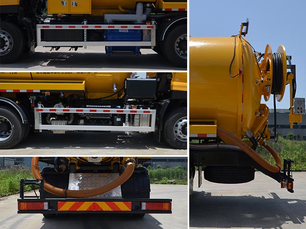 污水罐为圆形截面,罐体为圆形截面,罐体外形尺寸(直径字倍纬?(mm):Φ2112?200,有效容积:13立方米;清水罐为圆形截面,罐体外形尺寸(直径字倍纬?(mm):Φ2112?600,有效容积6.66立方米。清水罐和污水罐不能同时满载。整车仅采用轴距为4350+1350(mm)原底盘。主要专用装置为真空抽吸及高压清洗系统。后防护栏的材料材质:Q235;侧护栏的材料材质:铝合金型材;防护栏安装采用螺栓联接;后护栏截面尺寸/离地高(mm):110?40/480。装有ABS,ABS型号/生产厂家:3631010-C2000/东科克诺尔商用车制动系统(十堰)有限公司,ABS 8/东科克诺尔商用车制动系统(十堰)有限公司,4460046450/威伯科汽车控制系统(中国)有限公司。随底盘选装车头样式。随底盘选装后部灯具。 |