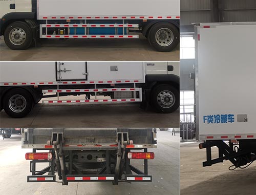 货厢顶部封闭,不可开启。随底盘选装驾驶室。选装液压尾板,液压尾板收起时离车辆最后端距离280mm,液压尾板质量550千克。选装侧面箱门型式。选装后门样式。选装制冷量相同的制冷机组。侧防护采用冷弯型钢/Q235-B,螺栓连接;后防护采用冷弯型钢/Q235-B,焊接连接。后防护截面高度尺寸140mm, 截面宽度尺寸50mm,下边缘离地高度420mm。选装限速装置,限速89km/h.ABS系统控制器生产企业/型号为威伯科(上海)管理有限公司/4460046300。安装具有卫星定位功能的行驶记录仪。发动机型号/油耗申报值(L/100km)对应关系为:MC07.25-60/26.5,MC07.27-60/26.5,MC07.29-60/26.5,MC05H.20-60/26.2,MC05H.23-60/26.2,MC05H.25-60/26.2,MC07H.29-60/26.5,WP6H245E61/26.4,WP6H270E61/26.4,WP4.6NQ220E61/26.3。主要专用装置为厢体和冷藏机组。选装采用直接供电方式的ETC车载装置. |