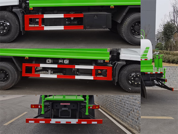 该车专用装置为罐体,滚刷等,用于护栏清洗作业;罐体有效容积:9.45立方米,罐体外形尺寸(长/长轴/短轴)关系为(mm):4200/2300/1400;安装前部滚刷时,前伸长度1400mm,对应长度为9200mm;选装不安装前部滚刷,对应长度为7800mm;防护材料:Q235碳钢,连接方式:左右侧面及后下部防护均采用焊接连接,后部防护断面尺寸(mm):120?0,后部防护离地高度(mm):495,随底盘选装驾驶室,ABS生产厂家;东科克诺尔商用车制动系统(十堰)有限公司, 浙江万安科技股份有限公司,型号:3631010-C2000, VIE ABS-Ⅱ。 |