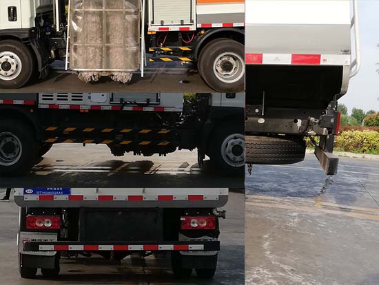 装备有水泵、液压系统、护栏清洗装置等,用于护栏清洗作业;仅选用3360mm轴距;选装选装照片1中外观喷涂;随底盘选装驾驶室样式;侧后防护装置材料均为:Q235,侧防护装置与车架连接方式为:螺栓连接,后防护装置与车架连接方式为:焊接,后防护装置尺寸为:截面100?5mm,离地高度450mm;ABS控制方式为4S/4M,ABS型号为CM4XL-4S/4M,生产厂家为广州瑞立科密汽车电子股份有限公司.