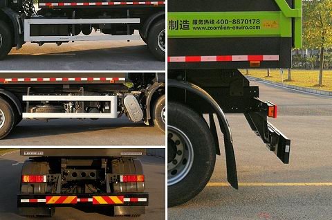 该车装有垃圾箱体、卸料机构,用以收集、转运垃圾作业;自卸方式为后卸;采用底盘4350+1350mm轴距;随底盘选装驾驶室外观,前悬为1480mm,整车长度为8530mm;前悬为1500mm,整车长度为8550mm.侧防护装置材料为铝合金,与车辆连接方式为螺栓连接,可选装其局部外观(含Logo、支架);后防护装置材料为Q345A,与车辆连接方式为螺栓连接;后部防护装置的断面尺寸为240?5mm,离地高度为480mm;随底盘选装发动机D6.7NS6B290,DDi75E350-60,DDi75E300-60;对应的油耗值(L/100km)为31.3、31.7、31.7.该车安装具有卫星定位功能的行驶记录仪;随底盘选装后处理器局部外观;随底盘装ABS,ABS型号/生产厂家:3631010-C2000/东科克诺尔商用车制动系统(十堰)有限公司,ABS 8/东科克诺尔商用车制动系统(十堰)有限公司,4460046450/威伯科汽车控制系统(中国)有限公司.还可选装选装底盘后横梁外观. |