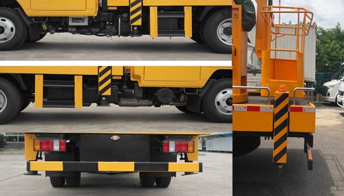 | 1.ABS系统型号:APG3550500A,ABS系统生产厂家:浙江亚太机电股份有限公司。该车为专用作业车。2.随底盘选装后尾部灯具,选装前脸样式,随底盘选装前置空气滤芯,选装不同尾部标识,选装14米举升臂及16米举升臂,当选装14米举升臂时专用装置前伸365毫米,整车外形长为6940毫米,当选装16米举升臂时专用装置前伸1015毫米,整车外形长为7590毫米,当选装14米举升臂及16米举升臂时整备质量均为5435kg。3. 侧面防护装置材料:Q 235,连接方式:螺栓连接;后下部防护装置材料:Q 235,连接方式:焊接,断面尺寸:100毫米?0毫米,离地高度:415毫米。该车专用装置为高空作业装置,主要由工作臂、工作平台、液压系统、电气系统、支腿组成,可广泛应用于市政、园林、路灯、电力、交通等高空作业领域. |