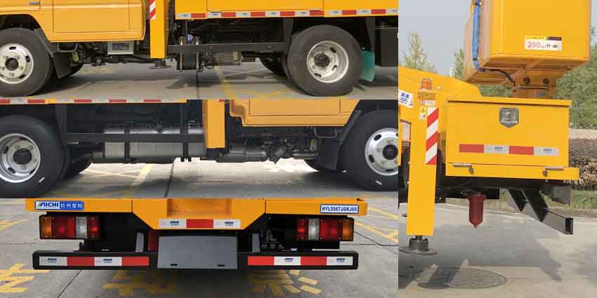 | 1、前伸0mm,后伸180mm。2、侧面防护装置采用Q235A构件构成,与副大梁螺栓联接。3、后下防护装置采用Q235A构件构成,与副大梁螺栓连接,断面尺寸100mm?0mm,离地高度470mm。4、JX4D30B6H发动机最大净功率83kw,,JX4D30A6H发动机最大净功率:93kw。5、随底盘安装ABS,ABS型号/生产企业:APG3550500A/浙江亚太机电股份有限公司。6、可选装车尾导向灯。7、可选装绝缘工作斗,随底盘可选装门框黑色贴膜。8、该车型装备有支腿,转台,臂架,工作平台等部件的高空作业装置,可将作业人员与工具送到指定高度位置进行作业。 |