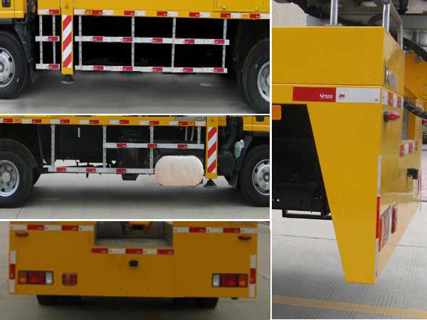 后伸270mm。随底盘选装后视镜款式及“NQR”标牌。选装后处理罩壳。该车型装备有支腿,转台,臂架,工作平台等部件的高空作业装置,可将作业人员与工具送到指定高度位置进行作业。ABS系统型号:APG3550500H1,ABS系统生产厂家:浙江亚太机电股份有限公司。侧防护材质为6063铝,与副车架用螺栓连接;后防护材质为Q235钢,裙板式结构,与副车架采用焊接连接,下缘离地高度500mm。 |