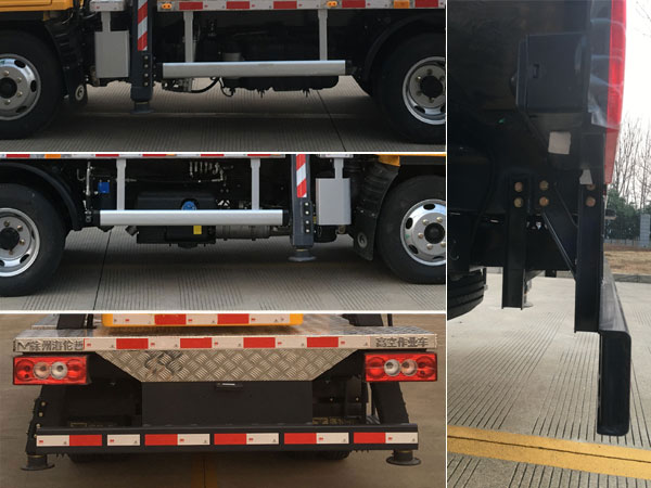 随底盘选装新前格栅及新logo.选装新前围。车长(mm)/前悬(mm)/轴距(mm)/后悬(mm)/后伸(mm)/整备质量(kg)对应关系:5730/1130/2850/1750/0/4020;5970/1130/2850/1750/240/4220。选装封闭式工作平台。该车型装备有支腿,转台,臂架,工作平台等部件的高空作业装置,可将作业人员与工具送到指定高度位置进行作业。ABS系统控制方式为4S/4M,ABS型号为CM4XL-4S/4M,生产厂家为广州瑞立科密汽车电子股份有限公司.侧防护材质为6063铝,连接方式为螺栓连接;后下部防护材质为Q235钢,连接方式为螺栓连接,断面尺寸为120mm?0mm,下缘离地高度400mm。 |