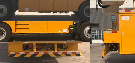 该车仅采用4500mm轴距底盘,前伸420mm.专用装置:臂架、绝缘臂、工作平台,用于举升运送专业人员进行高空作业和市政抢修.侧防护装置由整体式裙边结构代替,材料Q235,连接方式焊接;后防护装置材料:T700,连接方式与纵梁后部焊接,后部防护装置截面尺寸150mm?0mm,离地高度450mm.ABS系统型号/企业对应关系:ABS-E/威伯科汽车控制系统(中国)有限公司,ABS/ASR-24V-4S/4M/东科克诺尔商用车制动系统(十堰)有限公司.选装上装结构.随底盘选装驾驶室. |