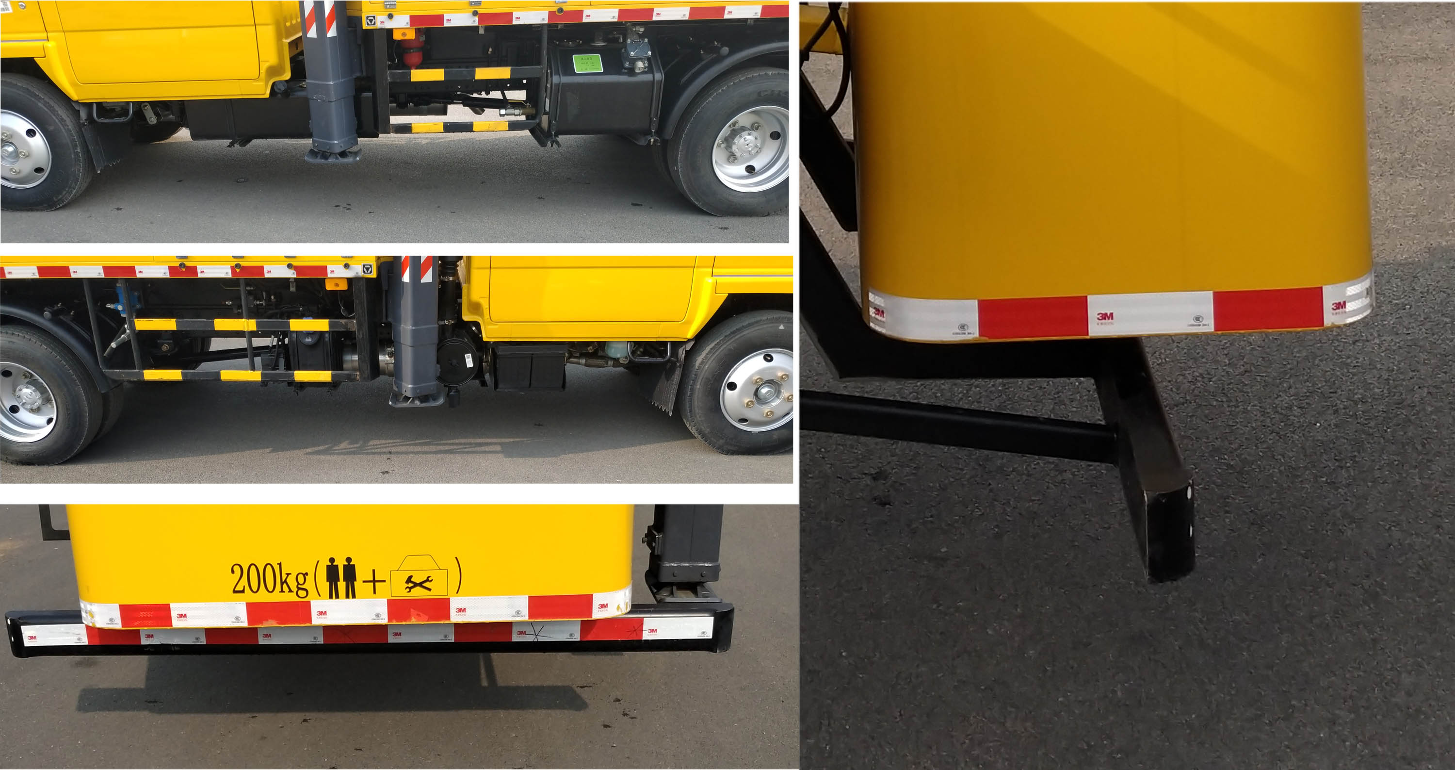 前伸395mm,后伸380mm.侧防护装置为金属护栏,材质Q235A,螺栓连接;后防护材质Q345A,截面高100mm,截面宽60mm,离地高490mm,连接方式为焊接式连接.该车专用装置为高空作业装置,可广泛应用于市政、园林、路灯、电力、交通等需要高空作业的领域.随底盘选装选装一种仅变化前面板、前格栅、前组合灯具的驾驶室;该底盘选装制动系统:装液压制动系统时,ABS及其控制器型号/生产企业对应关系为:APG3550500A/浙江亚太机电股份有限公司,CM4YL/广州瑞立科密汽车电子股份有限公司;装气压制动系统时,ABS及其控制器型号/生产企业对应关系为:CM4XL-4S/4M/广州瑞立科密汽车电子股份有限公司;选装后视镜款式;选装前部标牌"4KENGING/NJR/NHR/NKR/100P".选装爬梯,选装作业斗样式. |