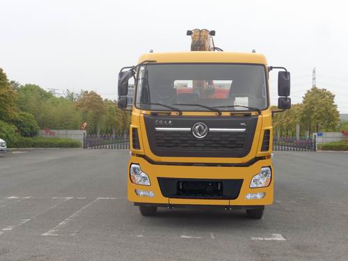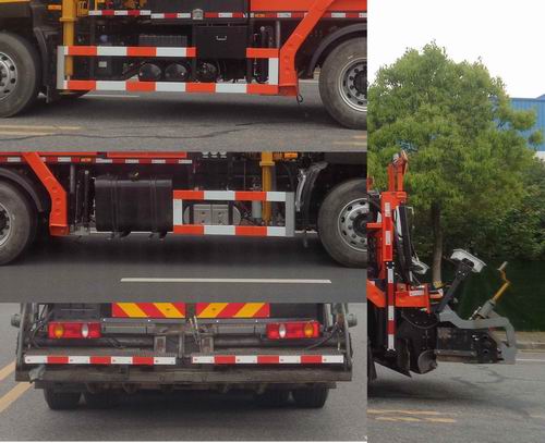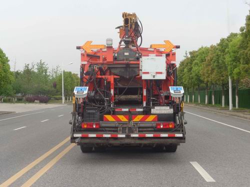 该车为沥青路面养护专用作业车,装备有沥青混合料恒温控制料仓、吊机、熨平摊铺等专用装置,吊机型号SQ5ZB2,重量 2100Kg,最大起升载荷 5000Kg,吊机的作用为装卸沥青混合料.前部安装抬举机构用于悬挂压路机时,前悬为1970mm,侧防装置材料为Q235A,与汽车大梁用螺栓连接。后防护装置采用车身结构代替,材料Q235A,车身结构离地高490mm,该车仅选用轴距4350+1350mm底盘。 随底盘装备ABS,ABS型号/生产厂家:3631010-C2000/东科克诺尔商用车制动系统(十堰)有限公司,ABS 8/东科克诺尔商用车制动系统(十堰)有限公司,4460046450/威伯科汽车控制系统(中国)有限公司。