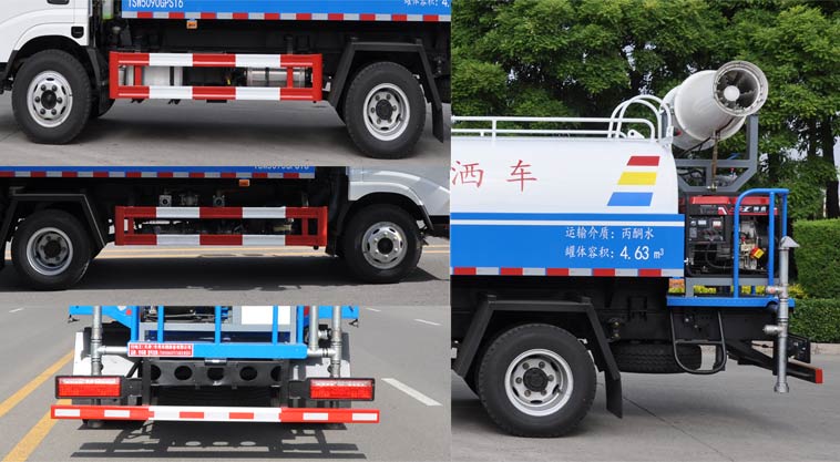 选装前面罩,选装后视镜,选装前组合灯,前雾灯为选装件。选装不带备胎,选装轮辋样式,选装"欧铃"字标,选装前保险杠,选装后组合灯。选装ETC装置。选装后部喷洒装置;ABS型号为:CM4XL-4S/4M,生产厂家为:广州瑞立科密汽车电子股份有限公司。罐体有效容积4.63立方米,罐体尺寸(长壮ぶ嶙短轴)(mm)/整备质量(kg)对应关系:带雾炮后部喷洒装置3400?750?200/3970,选装后部喷洒装置3600?725?180/3740;运输介质为丙酮水,密度950千克/立方米。侧面防护采用冷弯型钢/Q235B,螺栓连接;离地高度左430mm/右420mm。后防护采用冷弯型钢/Q235B,螺栓连接,后防护截面尺寸为:50mm?00mm,下边缘离地高度425mm。该车用于绿化喷洒作业,主要专用装置为罐体和喷洒装置。 |