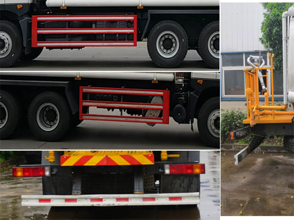 该车主要专用装置为水罐及泵,主要用于道路洒水园林绿化,冲洗作业.运送介质品名:水;介质密度:1000千克/立方米.罐体总容积:15.22立方米,罐体有效容积:14.5立方米,对应罐体外形尺寸(长卓碜高)(mm):6500?260?550.侧防护材料为Q235,连接方式为连接支架固焊在副车架大梁上.后防护材料为Q235,连接方式:用结构连接件固焊在主车后端,后部防护装置断面尺寸(宽赘?80?60(mm),后部防护离地高度:460(mm).ABS型号及生产厂家为:3631010-C2000/东科克诺尔商用车制动系统(十堰)有限公司,J ABS/焦作博瑞克控制技术有限公司.仅采用4350+1350(mm)轴距底盘.选装后部洒水装置及侧部结构.