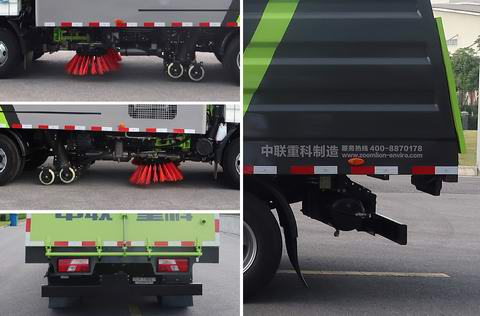 该车装有箱体和清扫装置,对路面进行清扫作业;该车标配时的整车长为6670mm,对应后悬为1700mm,整备质量6400kg,额定载质量1615kg;选配时的整车长为6780mm,对应后悬为1810mm,质量参数与标配一致;选装落叶破碎装置时的整备质量6600kg,额定载质量1415kg,整车长为6670mm,对应后悬为1700mm.侧面防护装置与工作装置相干涉;后防护装置的材料材质为Q345A,连接方式为螺栓连接;后部防护装置的断面尺寸为140?5mm,离地高度为420mm;随底盘装有ABS,ABS系统型号:VIE ABS-II,ABS系统生产厂家:浙江万安科技股份有限公司.随底盘选装驾驶室前脸外观.选装箱体顶部外观. |