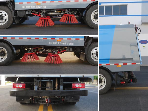 | 车辆主要专用装置有动力系统、清扫系统、抽吸系统、垃圾箱体,主要对路面进行清扫作业.仅选用3800mm轴距.随底盘选装限速装置,最高车速80km/h.选装前围及灯具.选装作业指示灯.选装新式车辆外部标识牌.ABS系统控制器型号/生产企业:ABS-E/威伯科汽车控制系统(中国)有限公司,ABS-VI稥/广州瑞立科密汽车电子股份有限公司.车辆侧面防护装置由专用装置扫刷代替.后下部防护装置的材料材质为Q235钢,连接方式为焊接,断面尺寸(mm)为80?60,最大离地高度为470mm. |