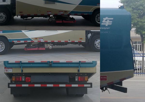侧防护为裙边结构,下部装有吸盘,后防护材料Q235,后防护截面高度尺寸120mm,截面宽度尺寸60mm,下边缘离地高度480mm;ABS及控制器型号为:APG3550500H1,生产厂家为:浙江亚太机电股份有限公司;该车专用装置主要由垃圾箱和吸盘组成,主要用于路面吸尘作业.选装侧面后处理结构.选装箱体外观. |