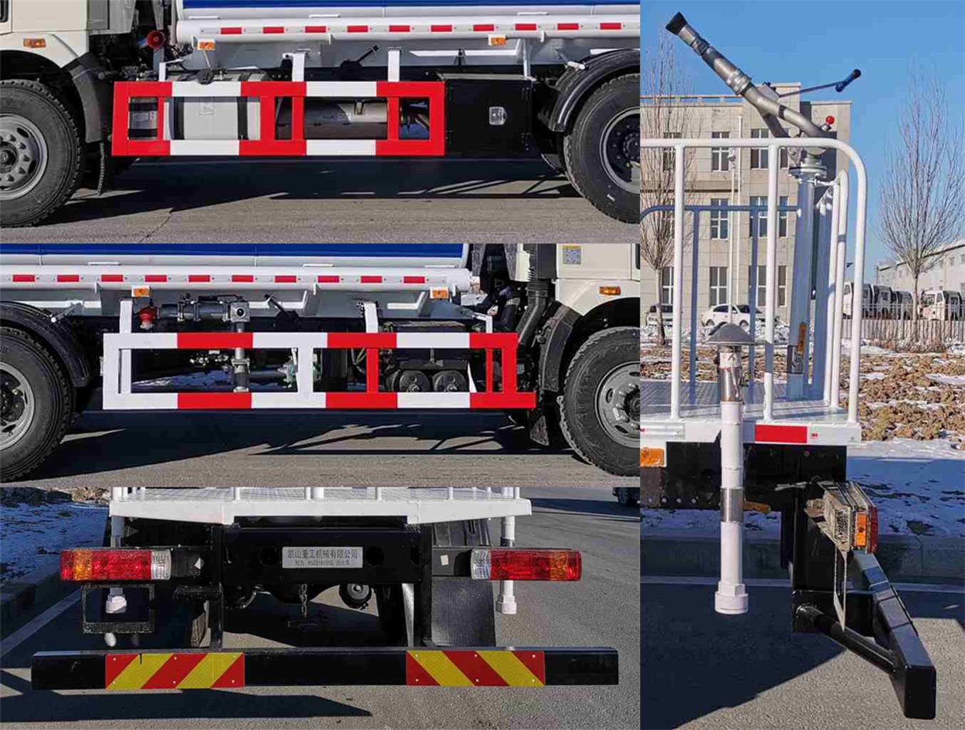 该车专用装置为,罐体、自吸式离心泵、洒水管路系统等组成;主要用于城市路面清洁,园林绿化洒水作业.该车可选装前下部万向鸭嘴喷头、罐体后封头上箭头灯.罐体有效容积为10.1立方米,罐体总容量为10.6立方米,运输介质为:水,密度为:1000千克/立方米,罐体外形尺寸(罐体长度壮ぶ嶙短轴mm):4630?200?250;侧后防护材质:Q235A,连接方式:螺栓连接,后部防护断面尺寸(mm):140?0,离地高度:420mm,ABS系统型号/生产厂家:CM4XL/长春瑞立科密汽车电子有限公司;装备限速装置,限速89km/h. |