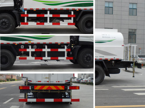1,罐体有效容积12.19立方米,罐体外形尺寸(长壮ぶ嶙短轴):5500?360?340(mm)。:运输介质:水,密度1000千克/立方米。2,该车型有2种配置:A(车前无喷水架),B(车前有喷水架);A配置时,整车长度为9890mm,接近角18?前悬为1480mm;B配置时,整车长度为11000mm,接近角12?前悬为2590mm,其中前伸为1110mm。 3,罐体前部的栅格为选装件。4,该车仅采用4350+1350(mm)轴距。5,侧防护装置材料为Q345A,与车辆采用螺栓连接,后防护装置材料为Q345A,与车辆采用螺栓连接,截面尺寸为:120?0(mm),离地高度为:500(mm)。6,ABS型号/生产厂家为:3631010-C2000/东科克诺尔商用车制动系统(十堰)有限公司;3631010—Z5300/东科克诺尔商用车制动系统(十堰)有限公司。7,该车由于加装了前喷水作业专用装置,故前下部防护不适用,不再加装。8,选装新造型的罐体,新款前喷水装置,罐体顶部护栏。 |