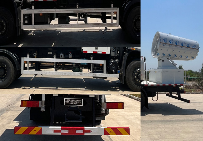 | 1,该车主要用于城市街道的喷雾抑尘,主要专用装置为喷雾总成;仅采用轴距(mm):5300.罐体总容量8.39立方米,罐体有效容积7.99立方米,罐体尺寸长卓碜高(mm):3600?400?420.加装前部智能水炮装置时:整车长/前伸/后伸对应关系为(mm):10910/610/710,10200/610;加装前部鸭嘴装置时:整车长/前伸/后伸对应关系为(mm):10480/180/710,9770/180;配置基本型时:整车长/前伸/后伸对应关系为(mm):10300/0/710,9590/0;选装后雾炮横置状态时:后伸为0mm.2.侧防护采用铝合金,螺栓连接;后防护采用Q235,螺栓连接,截面尺寸130?5mm,下边缘离地高度380mm;3.随底盘选装驾驶室.选装尾部雾炮样式.ABS型号/生产厂家:3631010-C2000/东科克诺尔商用车制动系统(十堰)有限公司,ABS 8/东科克诺尔商用车制动系统(十堰)有限公司, ABS-E 4S/4M/采埃孚商用车系统(青岛)有限公司,J ABS/焦作博瑞克控制技术有限公选装限速装置,限速89km/h. |