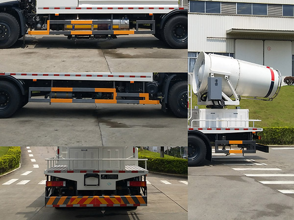 | 仅选用轴距5200mm;该车型有3种配置:配置A(选装A型雾炮)、配置B(选装B型雾炮)、配置C(选装C型雾炮)。各配置整备质量(kg)/载质量(kg)/长度(mm)/后伸(mm)/高度(mm)/前悬(mm)/后悬(mm)对应关系如下:配置A:13150/4655/10010/785/3940/1400/2625;配置B:12600/5205/9520/295/3940/1400/2625;配置C:10330/7475/8660/0/3650/1400/2060;上述3种配置均可选装开花式高压喷枪和后喷嘴;侧防护及后部防护装置的材料材质:Q235B;连接方式均为螺栓连接;后部防护装置的断面尺寸(宽赘?mm:60?30;后部防护装置的离地高度470mm;随底盘选装侧窗、前雾灯、遮阳罩、前格栅造型及灯具。ABS型号/生产厂家:3631010-C2000/东科克诺尔商用车制动系统(十堰)有限公司,ABS-E 4S/4M/生产厂为威伯科汽车控制系统(中国)有限公司;该车配置有喷雾系统等专用装置,主要用于改善空气质量,降低空气中的灰尘,雾霾等现象。 |