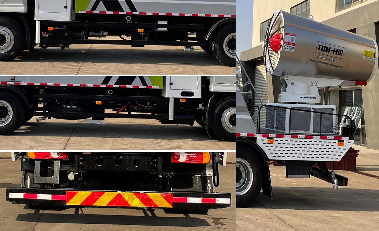 | 该车仅选用5300mm轴距;该车专用装置为喷雾系统装置、储液箱、气控系统,主要用于道路、广场或固定场所除霾降尘等作业; 罐体尺寸(长卓碜高)(mm)为:(上边长3095,下边长4040)?300?690.罐体有效容积13立方米.雾炮后伸尺寸(mm):930.ABS型号:VIE ABS-II;ABS生产企业:浙江万安科技股份有限公司;驱动电机额定功率:120kW,峰值功率:180kW;允许外接充电;储能装置种类:磷酸铁锂蓄电池;储能装置生产企业:宁德时代新能源科技股份有限公司;侧防护材料:Q235B;连接方式:螺栓连接;后防护材料:Q345B;连接方式:螺栓连接。后防护截面尺寸宽赘?mm):60?80;离地高度:400mm.;随底盘选装不同前脸结构、选装驾驶室脚踏结构、选装前轮不带踏圈结构、选装驾驶室侧围结构、选装电池水冷模块外观结构、选装溢水壶、选装电池护罩门锁. |