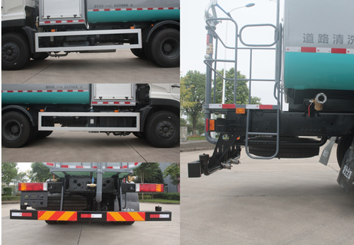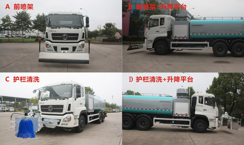 选用4350+1350mm轴距底盘,装有ABS,型号:3631010-C2000;生产厂家:东科克诺尔商用车制动系统(十堰)有限公司.罐体外形尺寸(长轴锥讨嶙长度)(mm):2280?480?000,运输介质名称:水,密度1000千克/立方米;该车工作装置有4种配置:A(前喷架),B(前喷架+升降平台),C(护栏清洗装置),D(护栏清洗装置+升降平台);配置A或C时:前伸1200mm,外形尺寸高度为3070,整备质量为11800,额定载质量为13070,有效容积13.72立方米;配置B或D时: 前伸1200mm,外形尺寸高度为3300,整备质量为12300,额定载质量为12570,有效容积13.19立方米;侧面防护装置的材料为铝合金,连接方式为螺栓连接;后防护装置材料为Q235A,连接方式为螺栓连接,断面尺寸为140?0mm,离地高度为475mm,可选装前冲、鸭嘴、后箭头指示灯、后部上、下喷雾、左、右花洒等装置;专用装置由水泵、清洗装置、前喷装置、护栏清洗装置、升降平台及罐体等组成,专用功能为道路清洗、保洁、护栏清洗等作业;罐体外观颜色及文字喷涂位置可变化. |