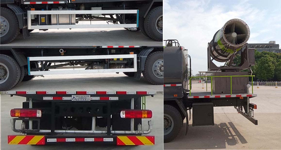 | 1、 该车主要用于城市街道的喷雾抑尘,主要专用装置为喷雾总成,罐体总容积7.29立方米,有效容积6.8立方米,有效容积罐体外形尺寸(长卓碜高)(mm): 3300?380?670;选装驾驶室前部无自动水炮,选装雾炮形状,雾炮支架,雾炮控制器位置,副发动机排气管位置,选装不带箭头灯。该车仅选用轴距4700mm。整车外形长/前伸/前悬/后悬/后伸对应关系为(mm):9630/0/1430/2700/800,10340/710/1430/2700/800。2、侧防护材料为铝合金,螺栓连接;后防护材料采用Q235,螺栓连接加焊接,截面尺寸140?0mm,下边缘离地高440mm。3、随底盘选装不同的驾驶室;可不选装遮阳罩,可不选装玻璃后风窗,可不选装驾驶室顶部天线,选装保险杠,选装观察窗。4、ABS系统控制器生产企业/型号为威伯科(上海)管理有限公司/4460046300,采埃孚(上海)管理有限公司/4460046300,随底盘选装EBS,EBS系统控制器生产企业/型号为威伯科(上海)管理有限公司/EBS3,采埃孚(上海)管理有限公司/EBS3。 |